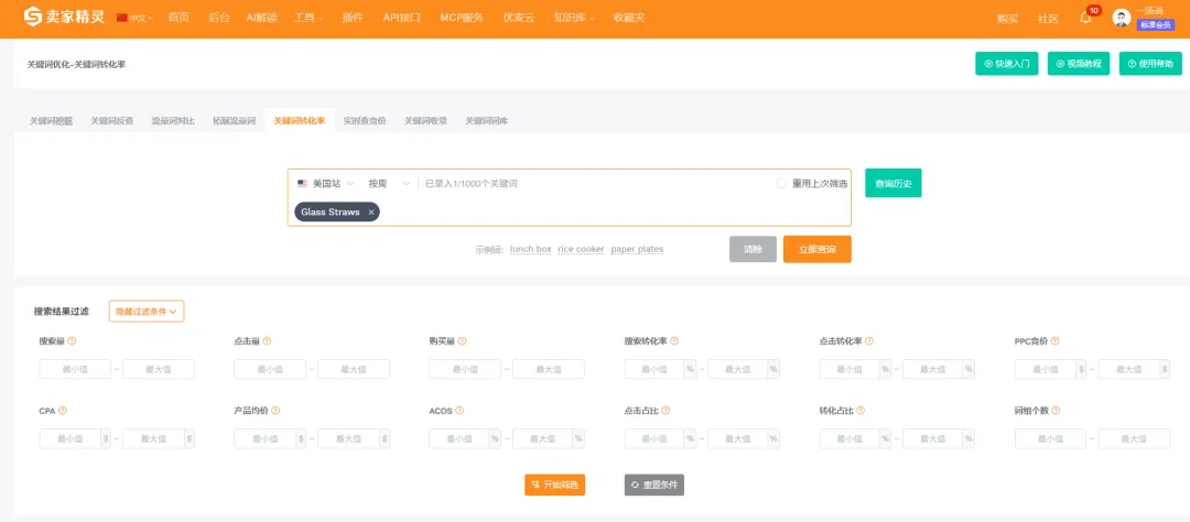 打开卖家精灵,进入【关键词优化-关键词转化率】功能入口。把"Glass Straws"作为种子词输入,点击查询。这个功能最多支持同时输入1000个词,如果你手里已经有备选词库,可以整批丢进去跑,不用一个一个查。
