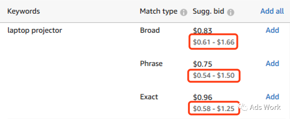 广泛匹配广告使用建议出价:Min.推荐出价 < 广泛匹配 bid < 推荐出价;