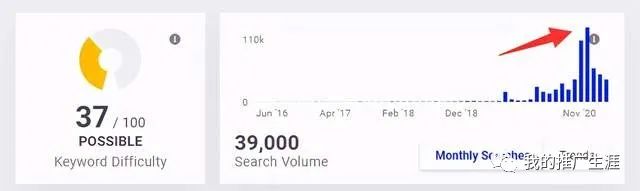 再深入的分析的话,发现其实引流的最主要关键词就是feng shui bracelet,在谷歌排名首页第5,利用kwfinder工具查看可以发现“fengshui bracelet”搜索量今年暴涨,不知道是不是跟疫情影响有关系,最高的时候搜索量冲到了11万搜索人次单月。