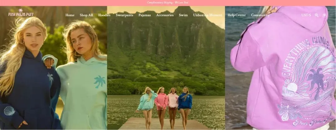 原告Pink Palm Puff Ltd是一家来自加拿大的企业,以海岸生活为灵感,主打高端休闲服饰的设计与销售。旗下Pink Palm Puff是加州的轻奢生活方式品牌,专注于连帽衫、泳衣、睡衣等休闲服饰,将柔软的高端面料与精心设计的细节相结合,创造出既适合日常穿着又值得珍藏多年的单品。