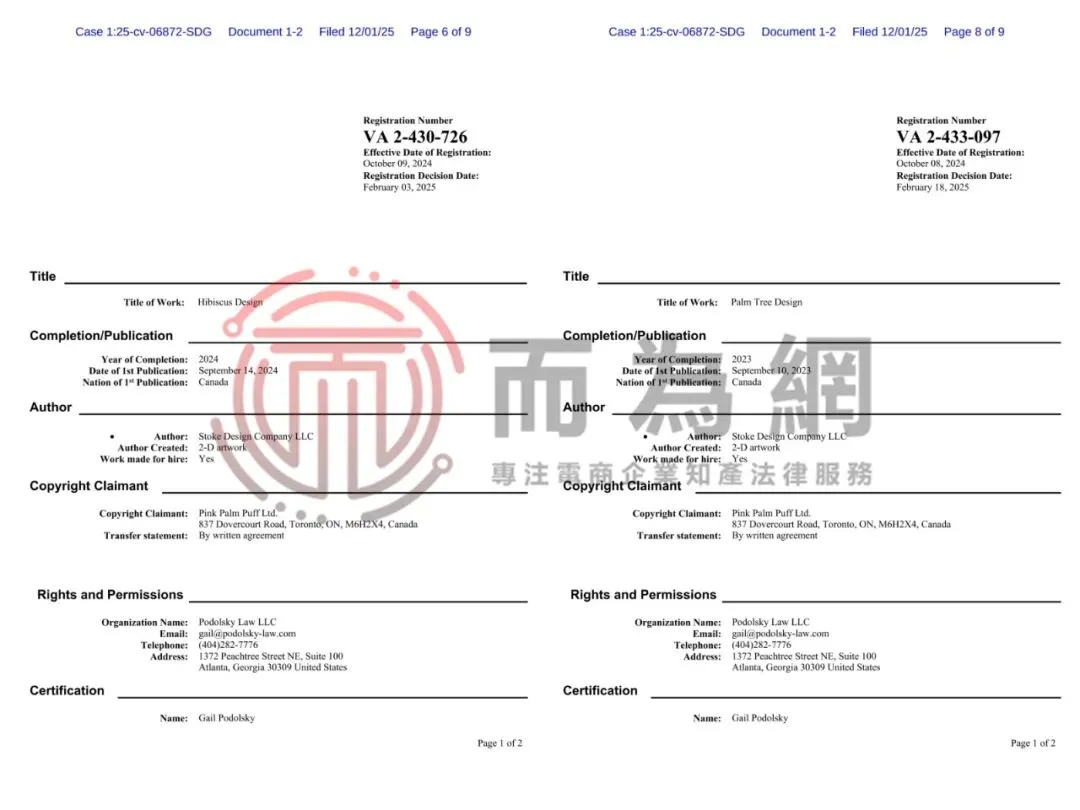 【侵权快讯】25-cv-6872 服饰卖家速看避雷!加拿大品牌Pink Palm Puff商标+版权发案维权中!