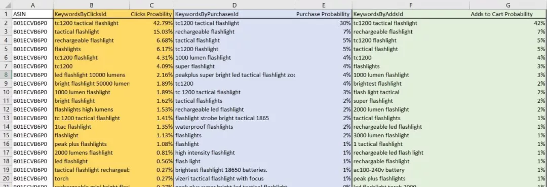 从下面一份解密的亚马逊内部搜索报告中我们可以看到15.03%的时间,当买家搜索tactical flashlight时,他们点击PeakPlus卖家的Listing。5%的时间,当买家搜索tactical flashlight时他们继续购买这件商品。