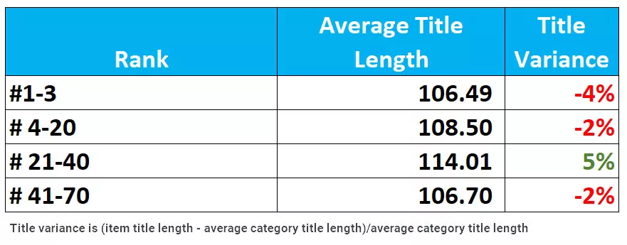 从下图的一份亚马逊市场研究报告中,我们可以看到那些排名更高的商品反而拥有更精炼的标题。