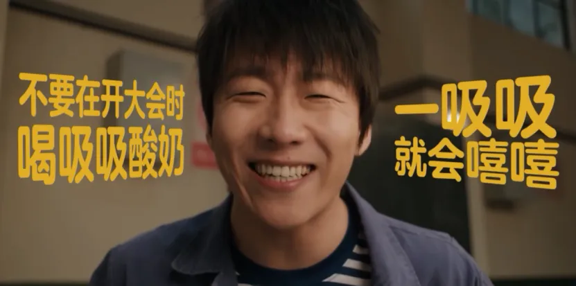 但这支广告里,王天放就没这么幸运了。无论是在办公室、在战阵前、在朋友哭诉时,一切严肃到不能笑的地方,偷偷喝了一口纯甄吸吸酸奶——然后,嘴没忍住,笑了。