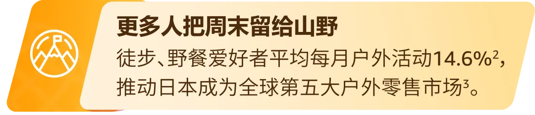 在日本,人们参与户外活动的主要原因是渴望感受和亲近自然,其次是希望摆脱日常生活的节奏。预计到 2030 年,日本露营市场的用户数量将达到 1247 万9。消费者不再追求负重越野,而是青睐颜值在线、轻便易携、易于分享的装备。这让轻量化帐篷、复古露营椅、便携炊具等兼具功能与格调的品类,迅速成为社交与生活的热门之选。预计到2026年,日本户外用品市场销售收入将达到约4937.4亿日元10。