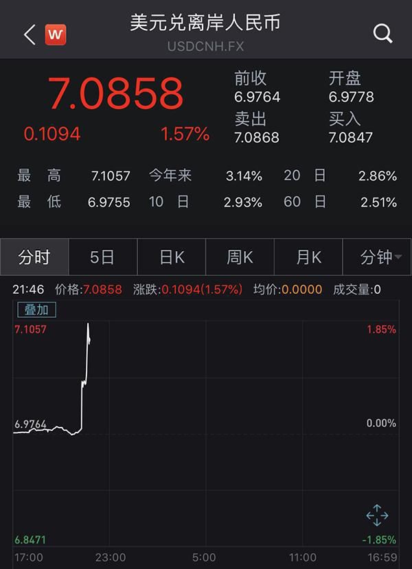 随着8月5日9时15分出炉的人民币对美元中间价跌至6.92关口,离岸、在岸人民币对美元汇率直线跳水。分时数据显示,早上9:16,离岸人民币直接从6.9828元跌至7.0315元,1分钟之内,下跌了将近500点。此后,离岸人民币继续快速走低,跌破7.1元之后有所反弹。相比前收盘价,上午离岸人民币最多时下跌了1293点,幅度高达1.85%。截至11:30,离岸人民币最低报7.1057元,在岸人民币最低报7.0424元。