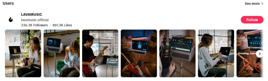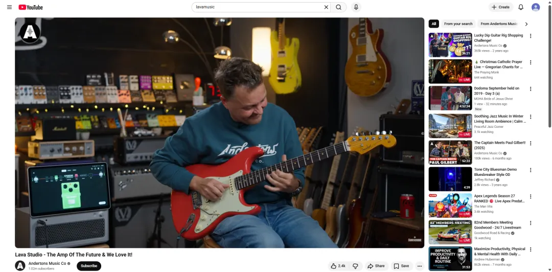 LAVA精准布局YouTube中层腰部KOL矩阵,核心绑定两类高匹配度博主——一类是深耕新手教学的吉他垂类达人(如Darrell Braun),另一类是专业乐器评测机构账号(如Andertons Music Co)。这些博主避开生硬广告,以“用户视角”输出深度内容,将复杂功能转化为直观价值,快速拉近与潜在用户的距离。