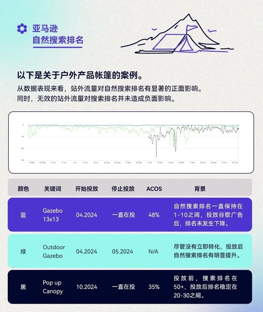 本期客户案例是一家专注于户外产品的品牌,希望通过提升其在亚马逊上的自然搜索排名来增加产品曝光和销量。我们为其提供了针对性的站外流量解决方案,下面是具体的数据表现。
