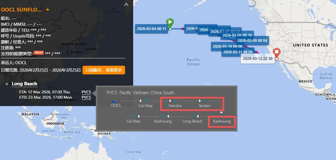该轮涉及EVERGREEN/OOCL/ONECOSCO SHIPPING四家船公司共舱,船舶航行数据还显示,在事故发生前,“OOCL SUNFLOWER”号于2月曾依次挂靠洋浦、南沙、盐田和高雄等港口装载出口货物。目前船舶定位显示,其仍在北太平洋航行,正向美国西海岸方向推进。