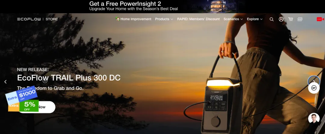 很多做储能或3C类目的独立站,首屏满眼都是“2000Wh”、“1小时快充”、“磷酸铁锂电池”这些冷冰冰的技术参数。但EcoFlow的独立站更强调“场景下的安全感”。