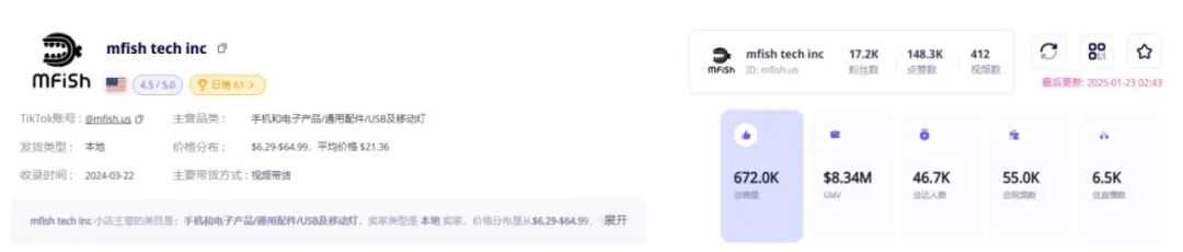 根据Echotik数据显示,所属店铺mfish tech inc的销售额达834万美金,这一数字在众多数码配件品牌中显得格外突出。