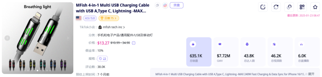 在全球电子消费市场的浪潮中,一款来自品牌MFish的充电线正悄然掀起一场出海风暴。它不仅在TikTok Shop上斩获了令人瞩目的销售佳绩,更是在海外消费者中赢得了极高的口碑,成为了数码配件领域的出海新宠。
