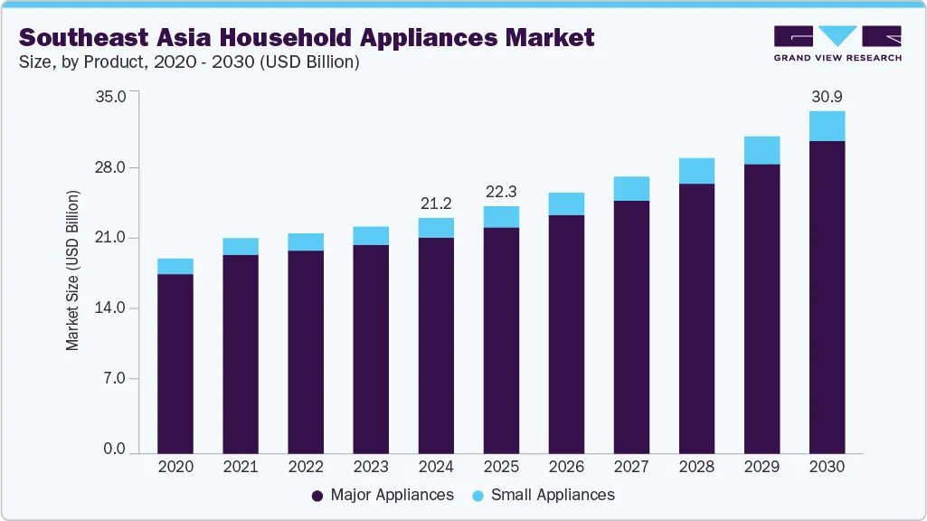 据 Grand View Research 数据,2025 年东南亚家用小电器市场规模达223 亿美元,预计 2030 年将增至 309 亿美元,年复合增长率 6.7%。