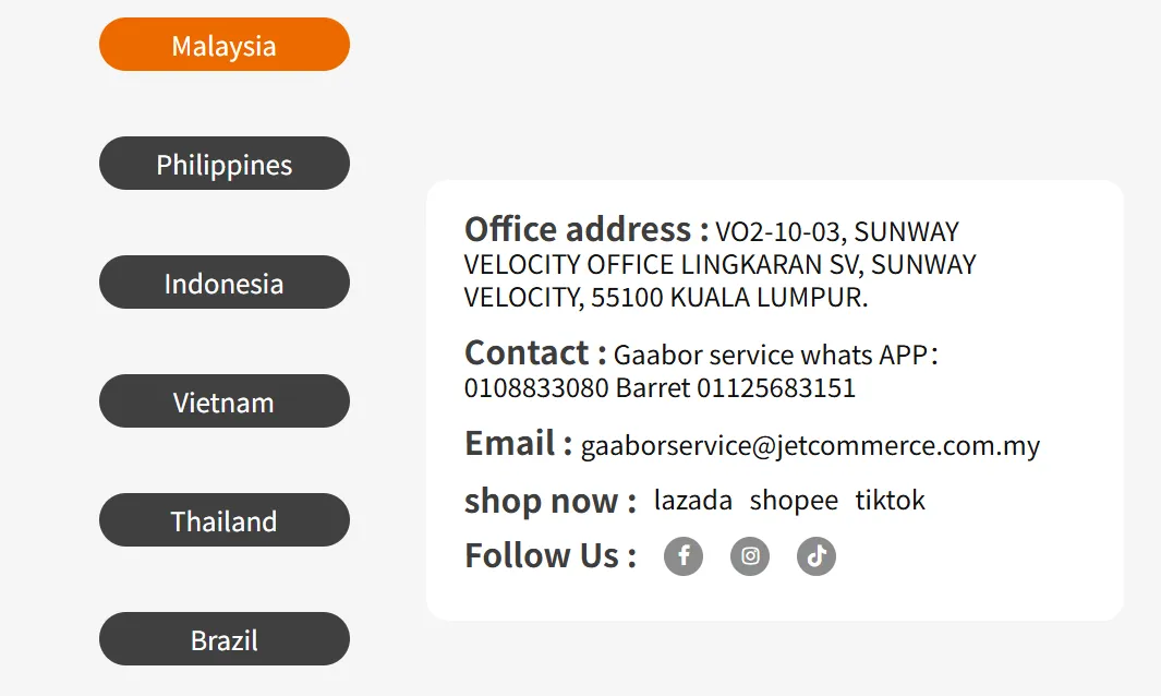 在积累了足够的线上影响力后,Gaabor 开始布局线下渠道,解决 “用户无法直观体验产品” 的痛点:在马来西亚开设官方旗舰店 @Plaza Metro Kajang,提供产品体验、售后维修等服务;在印尼建立了完善的线下门店与经销体系,进驻当地的 modern market 与家电卖场。