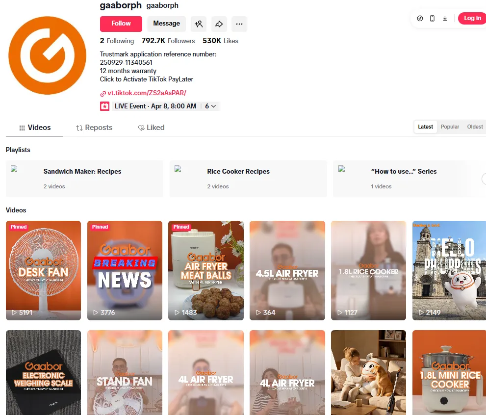 菲律宾账号 @gaaborph 粉丝量领跑全平台,核心在于绑定本土顶流明星 David Licauco,大量发布明星代言物料、直播切片、幕后花絮,借助明星效应快速涨粉;