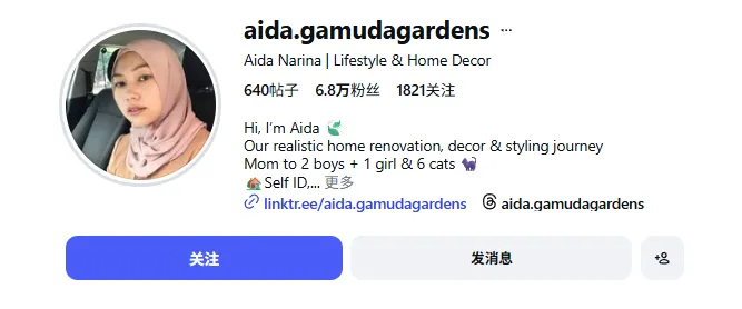 马来西亚本土生活方式 & 家居装饰达人 @aida.gamudagardens 是典型代表,粉丝 6.8 万,核心受众为穆斯林年轻宝妈与家庭主妇,与 Gaabor 的用户画像高度契合。