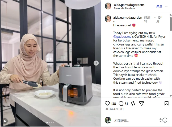 她结合斋月开斋饭的本土刚需场景,推广 Gaabor×GWEICH 联名 4.5L 空气炸锅,重点突出可视化玻璃窗口、蒸汽炸技术、儿童安全锁等贴合当地家庭的卖点,还穿插马来语口语增强亲切感,文末挂购买链接导流。单帖获 138 赞、31 条评论,互动精准,是 Gaabor“节庆场景 + 本土化达人 + 产品痛点” 打法的典型体现。