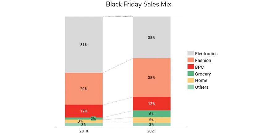 从历史上看,电子产品是黑色星期五期间最受欢迎的购买类别。不过最近,由于大流行驱动的在线依赖带来了新的信心,消费者开始从在线渠道购买更多类别。这反映在黑色星期五类别组合中: