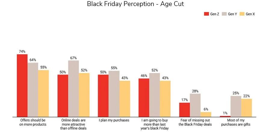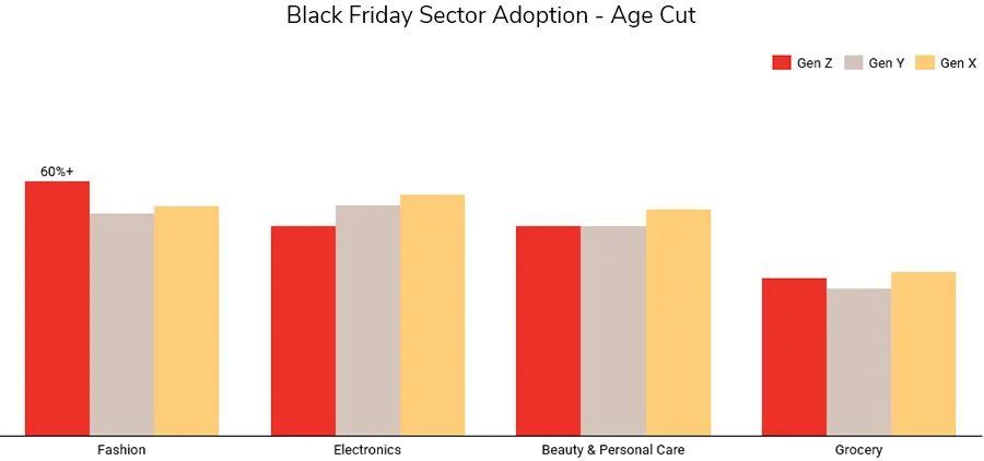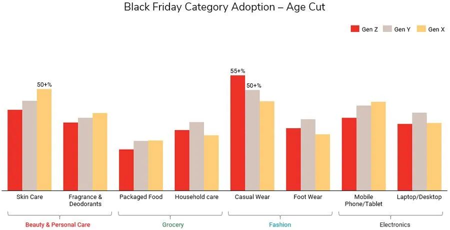 不同世代的行业吸引力略有不同,Z 世代在这个黑色星期五最倾向于时尚。这些年轻人希望以便宜的价格购买时尚的品牌服装。另一方面,Y 世代在电子产品、美容和个人护理领域处于领先地位。