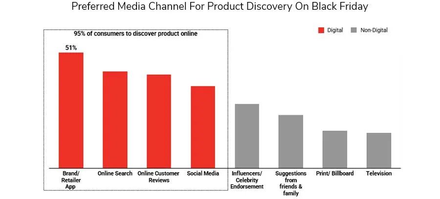 在黑色星期五期间,消费者越来越多地使用零售商/品牌应用程序来发现产品。在社交媒体中,短视频(TikTok)等新渠道增长迅速,而 Facebook 和谷歌产品发现生态系统继续保持强劲。