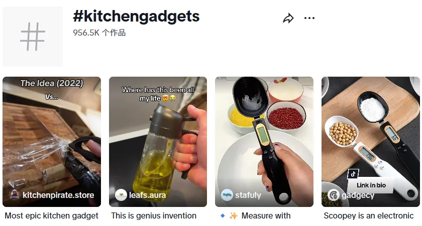 在TikTok上,#kitchengadgets(厨房小工具)标签下作品超95.65万条,大家分享日常生活中实用厨房小工具的视频播放量都非常高,其中面粉、鸡蛋搅拌器、食材称重器等尤其受欢迎。