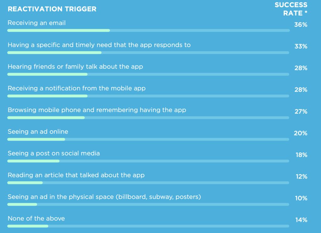 36% 的受访用户表示,电子邮件可以让他们重新打开某款应用,成功率最高。有 28% 的用户指出,经朋友或家人的提醒,他们才会想起某款应用。应用通知(28%)和浏览手机(27%)也会起到同样提示作用。