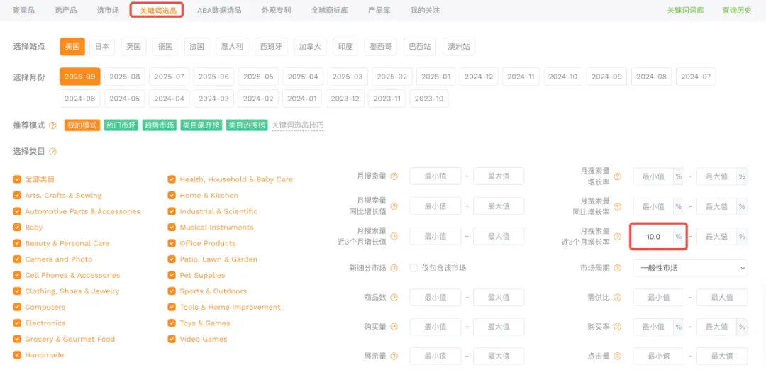 进入工具——关键词选品,选择想要进入的站点和类目,根据自己的实际情况进行筛选,如果不确定做哪个类目,就先都选上,再根据数据选择自己更感兴趣并且实力也允许的类目。