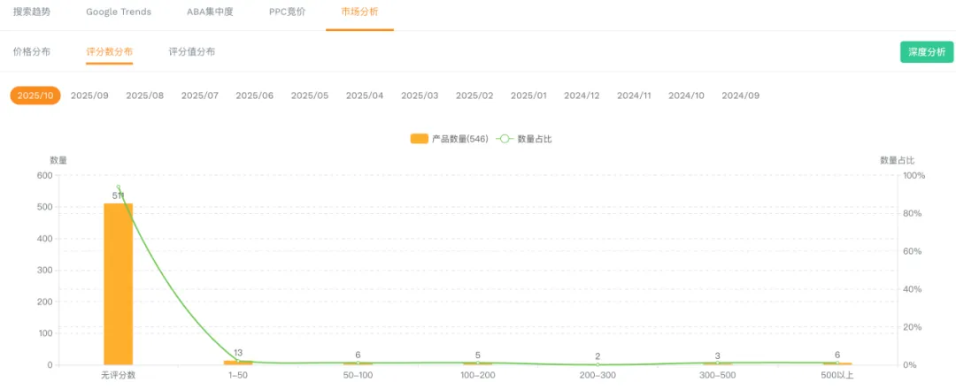 市场分析——评论数:500以上很少,说明对新品还是比较友好的