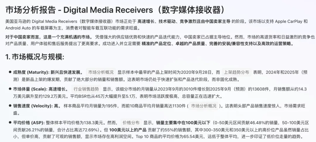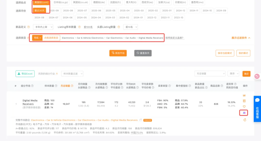 确定品类后,下一步要做的是明确竞争格局。过去我会手动打开多个ASIN页面,记录市场上的产品价格、销量、评论内容。现在只需在卖家精灵的【选市场】中选择对应的站点和类目,AI即可分析该市场的环境。