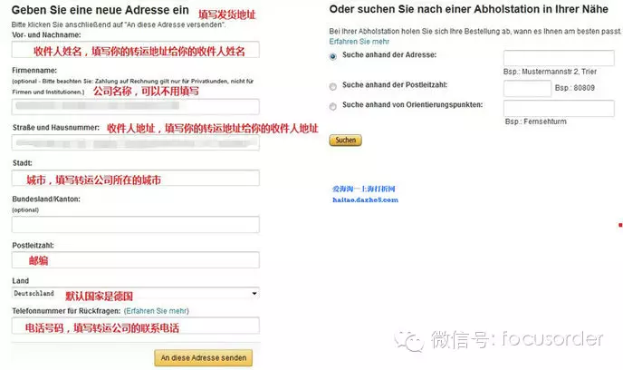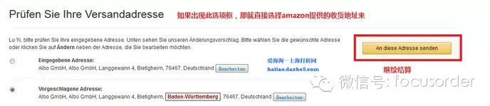 如果出现下图所示,选择amazon建议的收货地址,点击“An diese Adresse senden”。