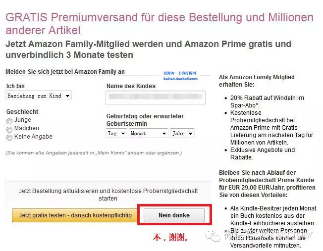 第一次下单,会弹出这个提示框,我们选择“Nein danke”。