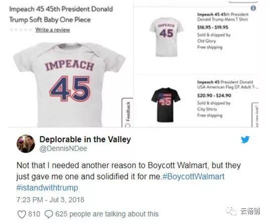美国网友们最近在Twitter上发起了一项“抵制沃尔玛”(#BoycottWalmart)的运动,导致沃尔玛删除了其线上平台一些反特朗普的商品,比如印有“Impeach 45”(弹劾45)的T恤(特朗普为美国第45任总统)。