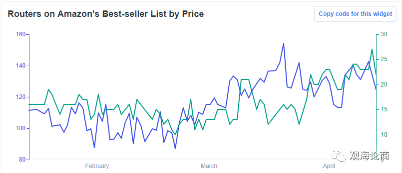 2月份的时候,畅销榜上一度只有10个路由器。现在每天多达27款,路由器的平均价格也上涨了。如果你在3月20日买了一台路由器,与1月31日看到的价位相比,可能平均多付了76%的钱。