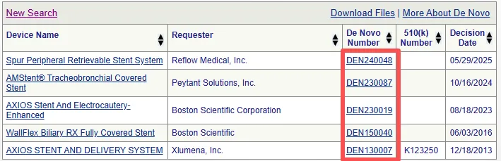 自 2010 年起,FDA 开始主动发布通过 De Novo 流程分类的医疗器械的决定摘要文件(Decision summary documents)。De Novo 决定摘要旨在客观、公正地呈现 FDA 批准 De Novo 申请所依据的科学证据。此外,对于希望将该器械作为对比器械的医疗器械制造商而言,De Novo 决定摘要还可作为参考,说明支持实质等同 SE(Substantial equivalence)所需的各类信息。这些信息可通过 De Novo 分类申请数据库(De Novo Classification Requests database)公开获取。