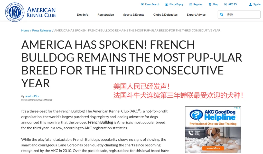 据统计,过去十年间,美国登记注册的法国斗牛犬数量增长超过1000%。2022年,法斗正式终结了拉布拉多长达 31 年的霸榜地位,成为全美最受欢迎犬种,并连续三年夺冠。