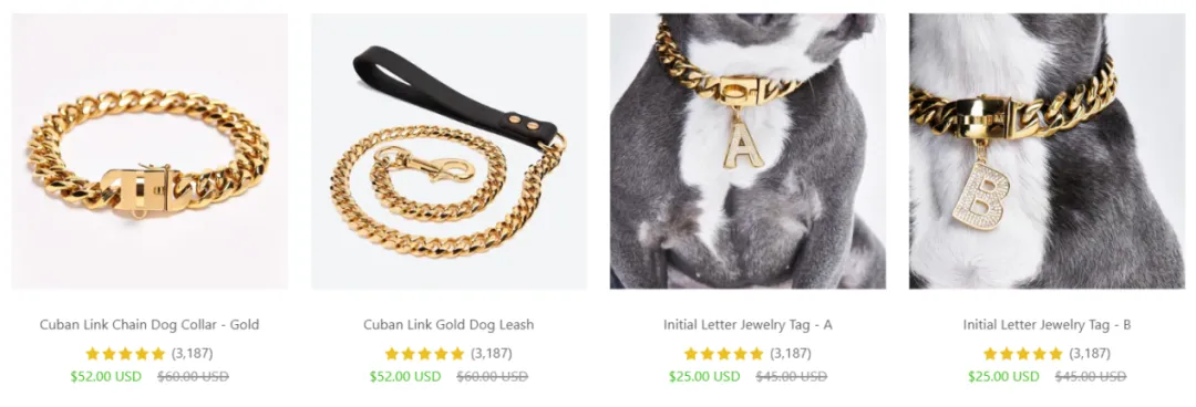 以其爆款牵引绳为例,六七十美元的单价是竞品(通常约20美元)的三倍有余;一条带吊坠的古巴链项圈价格甚至可以冲向 100 美元大关。尽管价格昂贵,但消费者依然愿意为其独特的设计与“生活方式”标签买单。