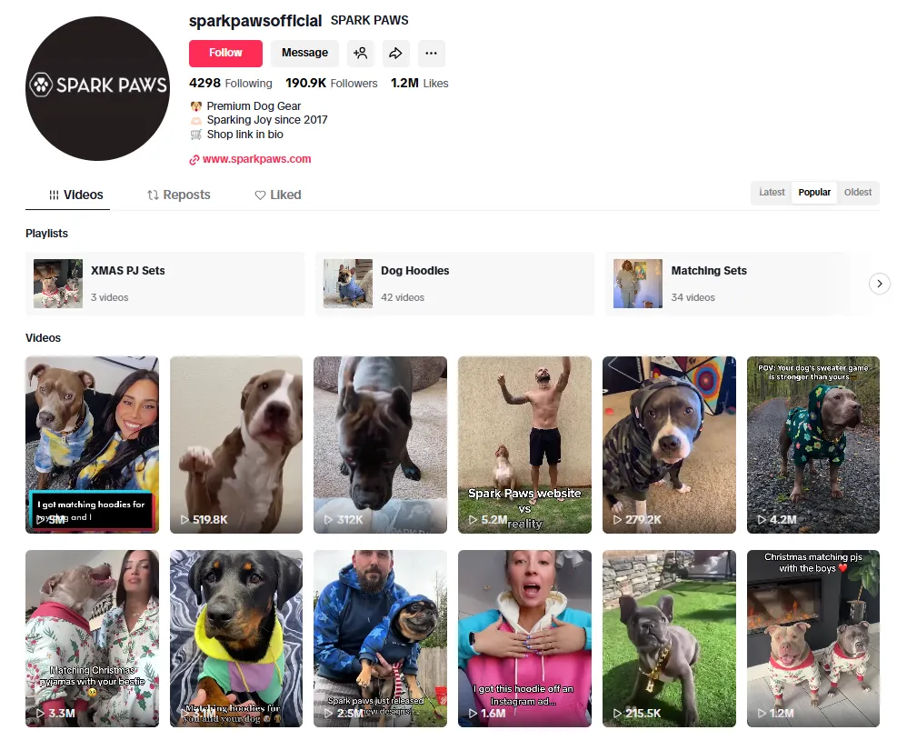 截至目前,Spark Paws在TikTok官方账号已积累超19万粉丝,其中3条视频播放量突破500万,百万级爆款内容多达13条。其中,亲子装互动类视频格外受欢迎,而与垂类达人合作的内容,最高一条甚至斩获2820万次播放。