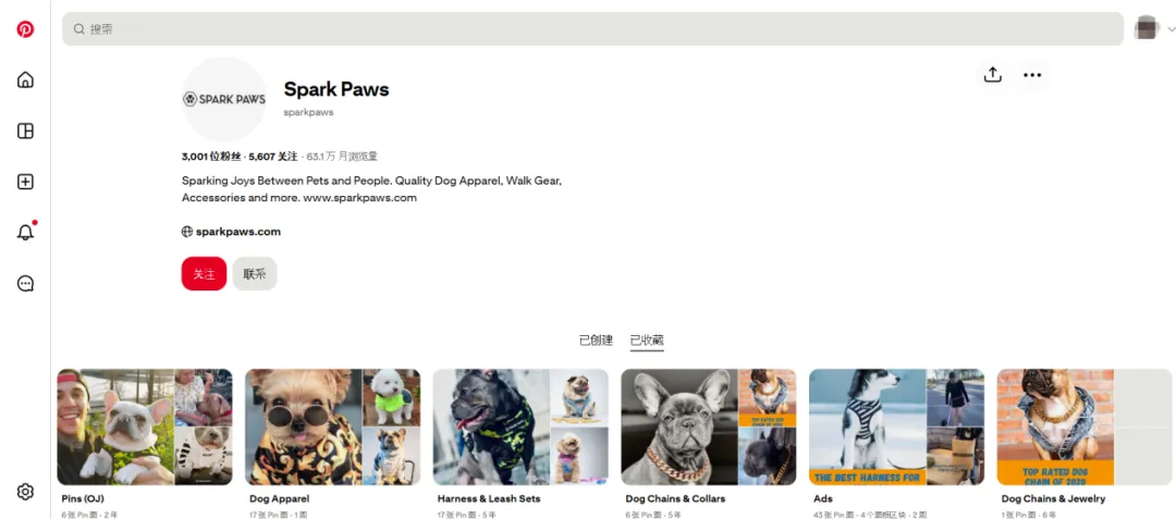 值得一提的是Pinterest——这个常被出海品牌忽视的平台,Spark Paws通过创建精细化的收藏夹将内容按犬种、体型、节日场景等进行分类。虽然账号粉丝数不到6000,但依靠平台的搜索和收藏机制,相关内容曾带来百万级月浏览量,为品牌持续输送稳定流量。