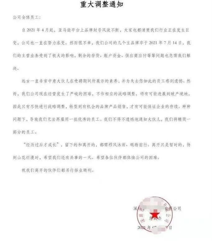 内容和多数受影响的亚马逊卖家一样,利润品牌被封杀,导致业务受到影响。为了企业能够长久发展,不得不忍痛割爱,进行人事缩编。通过这份通知可以看出,企业的无奈之举,以及对于事情处理的正面及担当。
