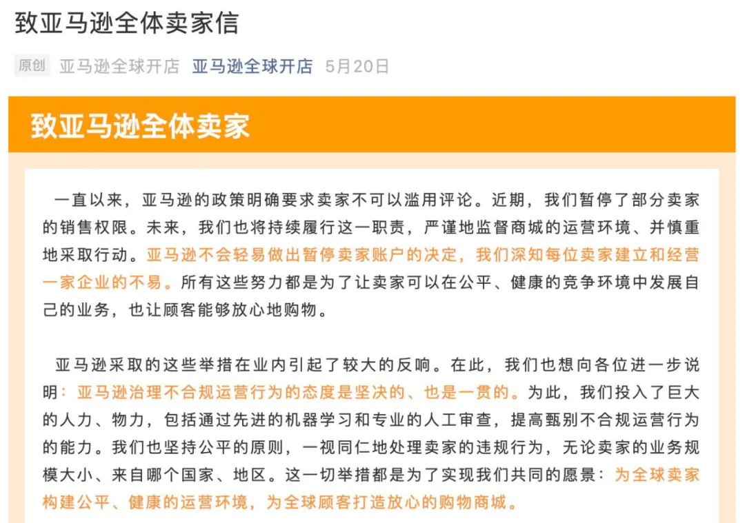 5月,在各大卖相继被封号后,亚马逊发布一封“致全体卖家信”称,明确要求卖家不可滥用评论,而部分卖家违反了规则;如果卖家认为判断有误,可通过申诉渠道澄清,并提交如何纠正违规行为的方案。