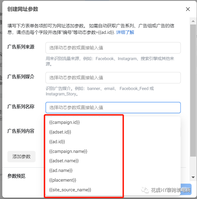 (动态参数的意思就是 Facebook 系统会根据您设置的动态参数自动填充相对应的数据进去以多方面收集不同版位、广告系列、广告组等数据)