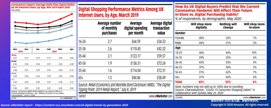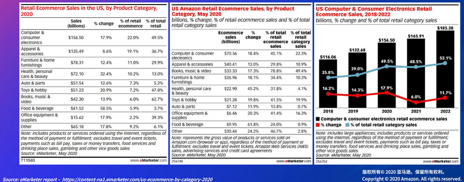 根据eMarketer分析,美国电子商务销售额在疫情的影响下将激增18%,达到近7100亿美元的市场体量。到2020年,电子商务可望达到总体零售行业的历史最高水平14.5%。而亚马逊在线上零售的发展,预计2020年将占美国整体电子商务销售额的38%。 计算机/消费类电子产品将会是排名第一的品类,可占到亚马逊美国整体销售额的26.2%。 后疫情时代的消费者行为改变 一份英国消费者的报告,也显示研究发现了最大幅度的波动发生在年龄较大的人群中,因为他们被迫在家中进行线上购物,其次,根据WBD研究所的发现,65岁以上人群的平均数字交易价值高于16-24岁和25岁-34岁年龄段的用户;最后,也是最重要的一点,在疫情结束之后,很可能会有很大一部分的用户选择继续使用线上购物的方式。 美欧日推荐产品 北美站点: 手机支架 Cell phone stands 选品注意事项 耳机保护盒 Headphone cases 选品注意事项 1.建议选品阶段也要多关注耳机市场,针对销售表现好的耳机型号进行匹配的耳机保护盒开。 2.热门产品平均售价约在6-15美元间,建议可以选择7-12美元的市场做切入。 3. 颜色选择上仍建议以暗色调(黑、灰)为主。 家用办公桌 Home office desks 1.对比去年上半年,超过150%的销售增长。 2.中国卖家数量年对年成长了3倍。 3.在2020年3月之后,居家办公成为了新主流,产品受益于市场变化有了新的市场消费需求。 选品注意事项 1. 大件产品运营上难度较高,建议选品前至少要考虑产品运输成本、运输撞击测试、安装容易程度、产品所使用零件的可替代性……等等 2. 热门产品平均售价约都在100美元以上,卖家可以优先考虑将价格段设置在100-200美元。 欧洲站点 1.产品市场容量大,且有较多的细分类目可以进入,例如:办公、电竞、音乐制作等 2.中国卖家增速快,货源在成本上也有优势 3.全年的搜索热度都相对靠前,淡旺季不明显 选品注意事项 1.产品相对竞争激烈,进入前一定要根据目标消费者进行产品卖点开发,例如办公类关注尺寸重量,音乐制作更关注多单元音轨及降噪技术,电竞则会优先考虑外观设计及延迟。 2.热卖产品的价格较广,从20-200欧元都可考虑。 电视/投影支架 TV Mounts 1.市场成长快速但目前中国卖家占比仍处于较低的水平,还有很大的上升空间。 2.可能是受益于居家办公的新常态,在疫情间的搜索热度,稳定地持续上升。 选品注意事项 1.分析评论可发现,消费者关注的产品参数有产品的材质、产品载重、产品可调节角度范围,建议在产品详情页中清楚说明以上重点。 2.热门产品的价格区间约落在18 -55欧元之间。 3.主营显示屏的卖家可以考虑搭配销售。 手机挂载件 Cell Phone Mounts 1.市场体量增长与中国卖家销量成长的速度皆名列前茅,是欧洲站点持续增长的热门品类。 2.品牌集中度不高,对新品与新卖家相对友善。 3.搜索热度高,且包含各式各样的使用场景。 选品注意事项 1.消费者关注的产品参数包含:固定的方式、安装容易度、适配的手机型号与尺寸。 2.支持充电功能的支架类型有更高的增长速度。 3.热门产品的价格区间约在8- 30欧元之间。 日本站点 网红直播设备 1.主用于居家办公,远程聚会,自拍直播。 2.USB供电无需认证,电源供电需要认证。 3.市场不只需求量大,且体量上升速度极快。 选品注意事项 1.不同于欧美市场的喜好,日本更看重产品是否方便携带,多站点选品时要特别留意。 2.建议考虑多功能款,例如除照明外,还具备支架,光圈二合一等作用,产品更受欢迎。 对讲机 1.快速成长的产品类目,销售额、搜索流量都达到年对年100%以上的成长。 2.日本使用频率非常高,主流款为小型商用,可以优先考虑低功耗的入门级产品试水。 3.产品竞争度小,没有品牌垄断的情况。 选品注意事项 1.留意产品需要符合日本无线电波法认证。 2.热销品的客单价约在35-55美元之间。 3. 为了避免退货,产品参数一定要写清楚,例如耳机孔多大,有没有背夹,待机时长等。 电动碎纸机 1.正处在适合切入市场的时机,本土卖家培养消费者线上购买的习惯,市场成长速度快; 而中国卖家数量仍处在低占比,成长空间大。 2.产品生命周期相对长,基本三年内不需改动,若需要开发产品线,是较为稳健的投资选择。 选品注意事项 1.热门商品的客单价分布广,50-200美元都有。 2.日本特别重视连续使用时长,20升以上的机种至少需要能连续作业50分钟。 3.碎纸效能建议至少达到每分钟能碎40页。 电子产品实操建议 北美站点 电子产品成功上线经验总结: 1.必须遵守适用于这些商品和商品信息的所有联邦、州和地方法律以及亚马逊政策。 2.美国站电子类产品通常需要UL, FCC认证,可以参考卖家后台的服务提供商网络查找资料。 3.对产品的功能,特性以及核心技术做深挖研究,拉开与大众卖家的差距,奠定推广的竞争力。 电子产品运营常见失败案例: 1.初期直接选择入门槛较低的产品,结果产品因为过于同质化,面临激烈竞争,陷入价格战。 2.没有预先为产品的差异化和个性化做准备,例如外观设计(目标市场受欢迎颜色,款式,材质等),使用便捷度(可调节性,易安装),以及应用场景的通用性及搭配性(适配手机型号)。 3.选择回避审查而不是配合审查,结果导致产生更多的问题,建议遇到审查时,积极主动配合。 欧洲站点 电子产品成功上线经验总结: 1.欧洲站的产品安全审核较多,比较常见的CE证书/WEEE认证/欧代标标识等,建议都要熟悉