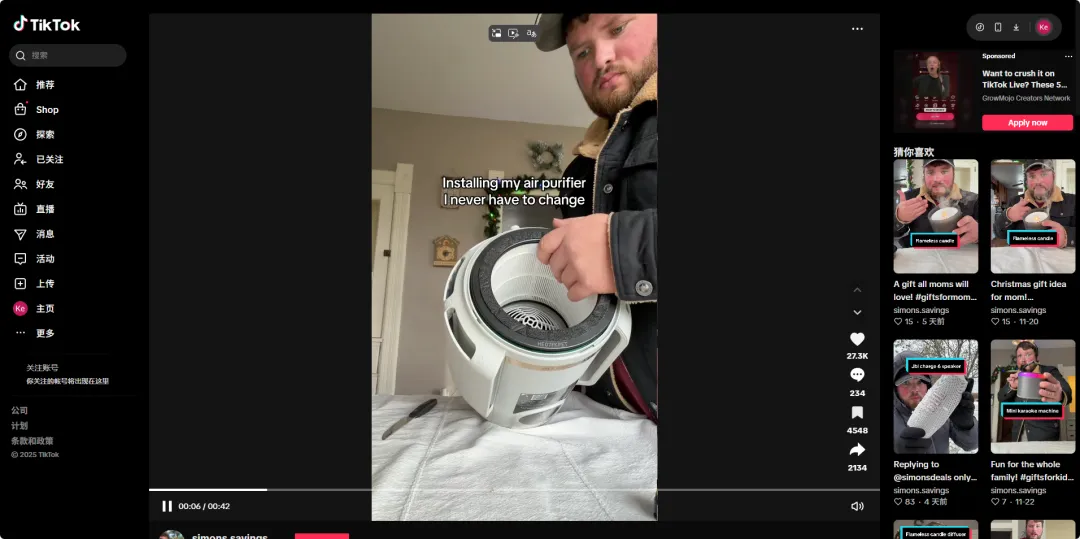Shark没有选择传统的“硬广轰炸”,而是借力达人 Simon's shop 的UGC内容,将产品植入到“应对生病季”的生活场景中。标签 #sickseason、*#airquality* 和 #allergies 的组合,精准击穿了美国家庭对冬季呼吸道健康的焦虑防线。