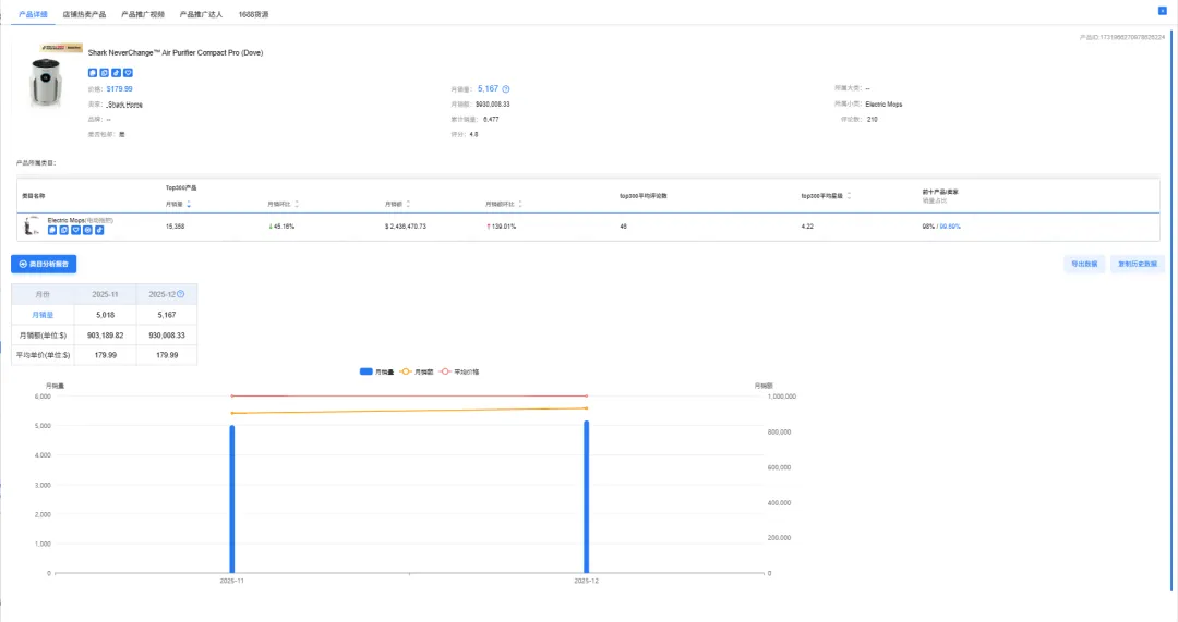 月销量: 5,167件 月销额: $930,008.33 平均单价: $179.99