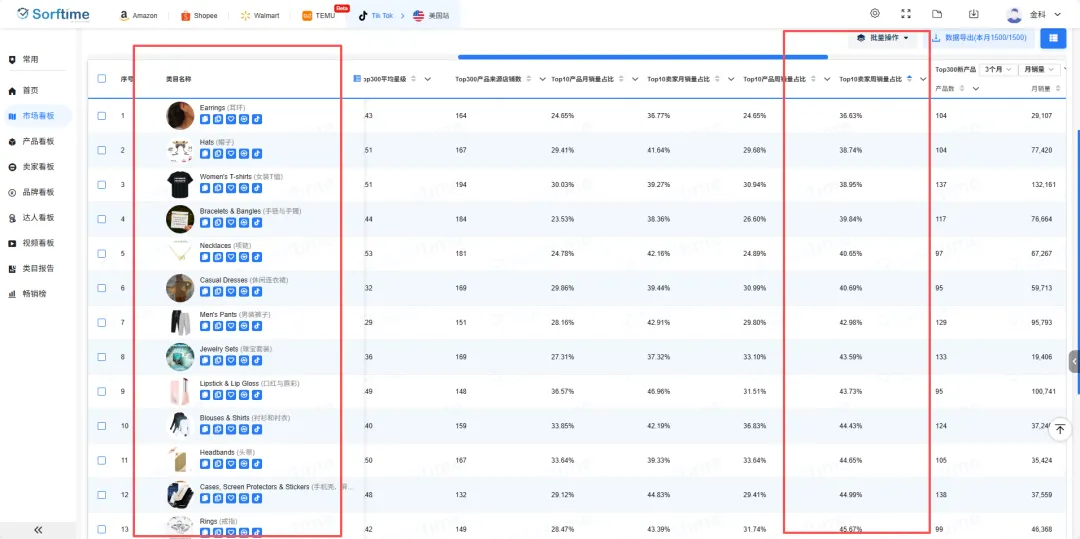 不要盲目选品。通过市场看板中的多维度选市场功能,结合季节性产品,寻找全站销量飙升市场。关注那些销量增长快、但垄断(Top10卖家占比)尚未固化的类目。