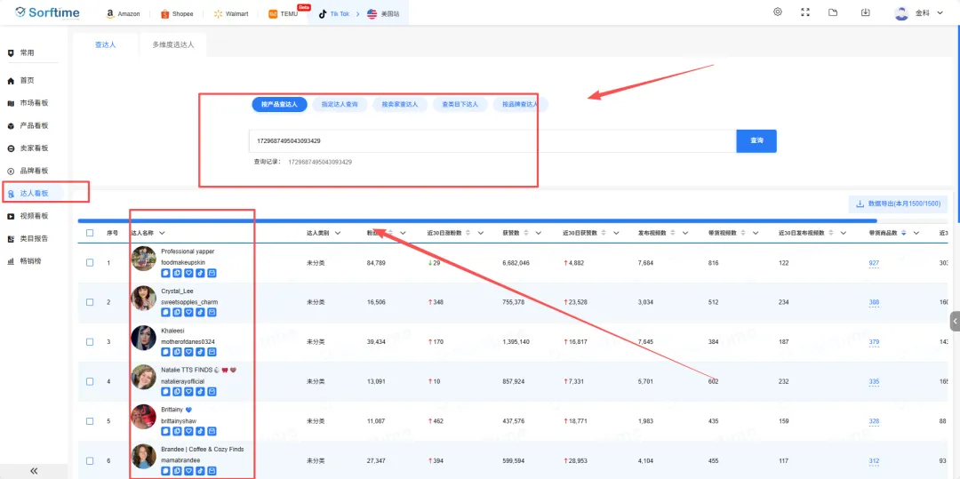 通过达人看板的指定达人查询或按产品查达人功能,找到那些在特定类目(如家居、健康)具备高转化率的中腰部达人(Micro-Influencers),而非单纯追求粉丝量。