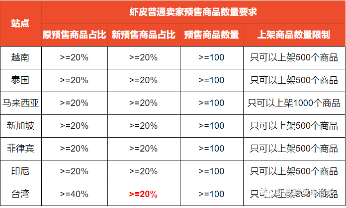Shopee平台台湾站点将变更普通卖家预售商品上架标准。如果预售商品个数超过100个(包含100个) 并且预售商品占比高于一定标准,则该店铺上架商品数量上限为500个(马来西亚站点为1000个)。超出部分将被系统自动隐藏, 且卖家无法上传新商品。