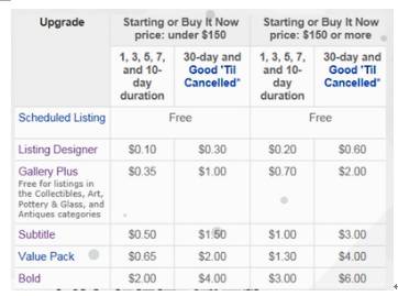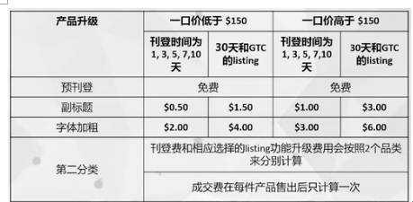 对于eBay的刊登,有些功能是可以升级的。比如说预刊登、副标题、标题字体加粗、第二分类等等,具体费用如下表: