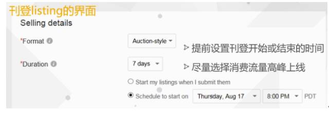 是指可以提前设置eBay刊登开始或结束的时间,尽量让刊登在目的国站点的消费流量高峰期间上线。这个项目是免费的,而且非常有用。