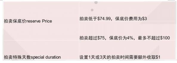 保底价收取的费用以75美元为分界线,小于75美元,保底价功能的费用为3美元。拍卖超过75美元,保底价功能的费用为拍卖价格的4%。但是最多不超过100美元。